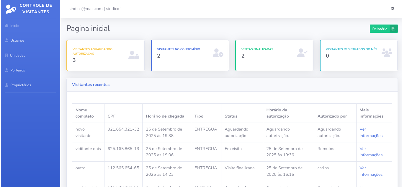 Este projeto tem como objetivo demonstrar uma aplicação simples para o controle de acesso de visitantes em um condomínio utilizando Django. A proposta é fornecer um dashboard para que o porteiro registre e acompanhe as visitas, permitindo monitorar os status de entrada e saída. Além disso, o síndico e administradores têm acesso a funcionalidades de gestão, como cadastros, alterações e exportação de relatórios em CSV.